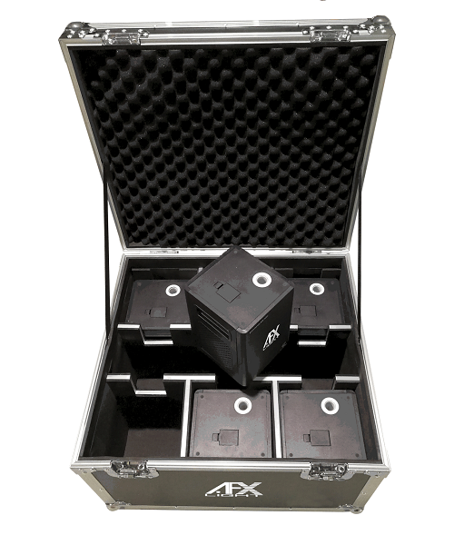 The AFX Sparkular-Mini Package consists of six Sparkular machines as well as a heavy-duty flight case that allows for easy transportation and also protects the units while in transit. The flight case is equipped with wheels and integrated handles for ease of transport while the soft in-lay and protective foam keeps the machines safe and secure in place. The case also comes with several compartments, six for the spark machines and one for all the cables and accessories you require.