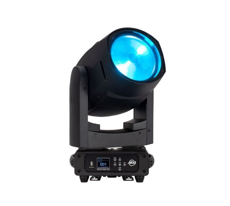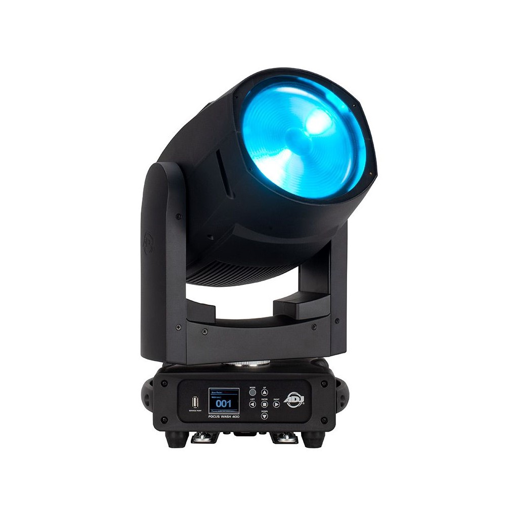 The American DJ FOCUS WASH 400 is a 400W moving head wash fixture driven by a 400W RGBACL (Red, Green, Blue, Amber, Cyan, and Lime) LED engine. A 6-inch Fresnel lens with a motorised zoom range of 9 to 43° generates an even light field.