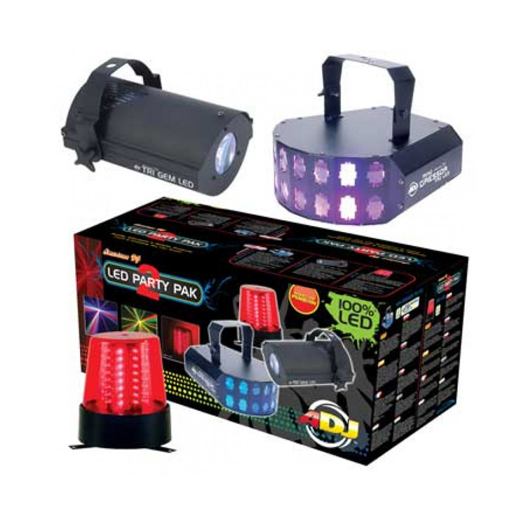 The ADJ Party Pak 2 is great for adding high-quality lighting effects to any live performance, DJ set, or AV show. The party pak 2 comes with a Mini Gressor Tri LED, Tri Gem LED, and B6R LED.