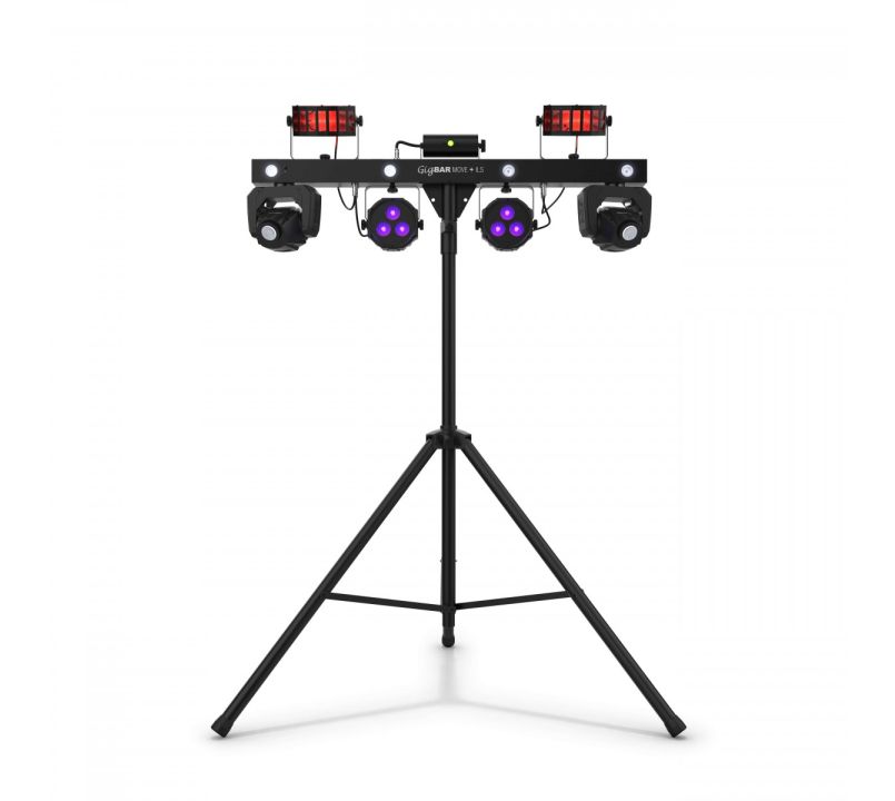- 5-in-1 lighting system with moving heads, derbies, par cans, washes, strobes, and a laser mounted on a single bar