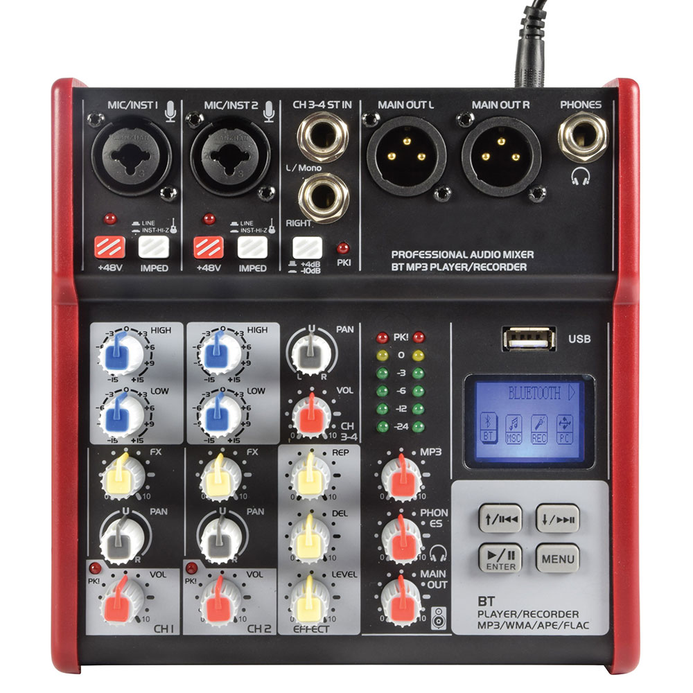 Input channels contain settings for High/Low EQ and Pan, and mono channels have an Effects level to adjust the amount of internal digital delay effect applied to vocals or instruments. An inbuilt player/recorder with a backlit display may accept a USB memory stick holding compressed music files in various formats or connect to a smart phone through Bluetooth. The output is given via a pair of balanced XLR connections and has extremely low noise operation for high-quality studio or live performances.