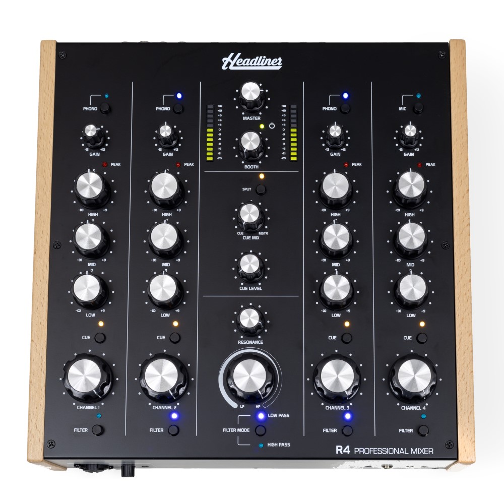 The Headliner R4 features four stereo channels, accommodating four Line inputs, three Phono inputs, and a dedicated Mic input. Each channel is equipped with essential tools like gain control with peak LED indicators, a 3-band isolator EQ, a headphone cue selector, a generously sized channel volume knob, and a filter activation switch, giving you complete control over your sound.