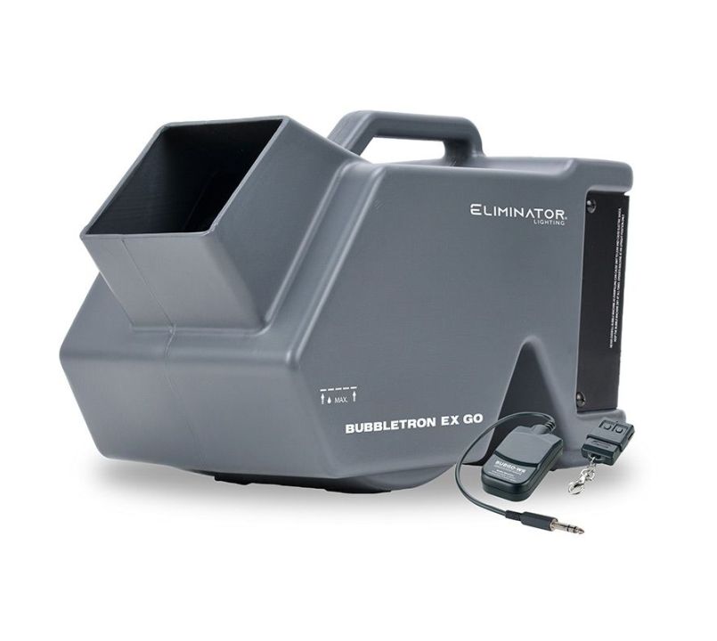 Introducing the Eliminator Lighting Bubbletron EX Go, a highly portable and lightweight bubble machine that operates on batteries for an impressive 5 hours per charge.