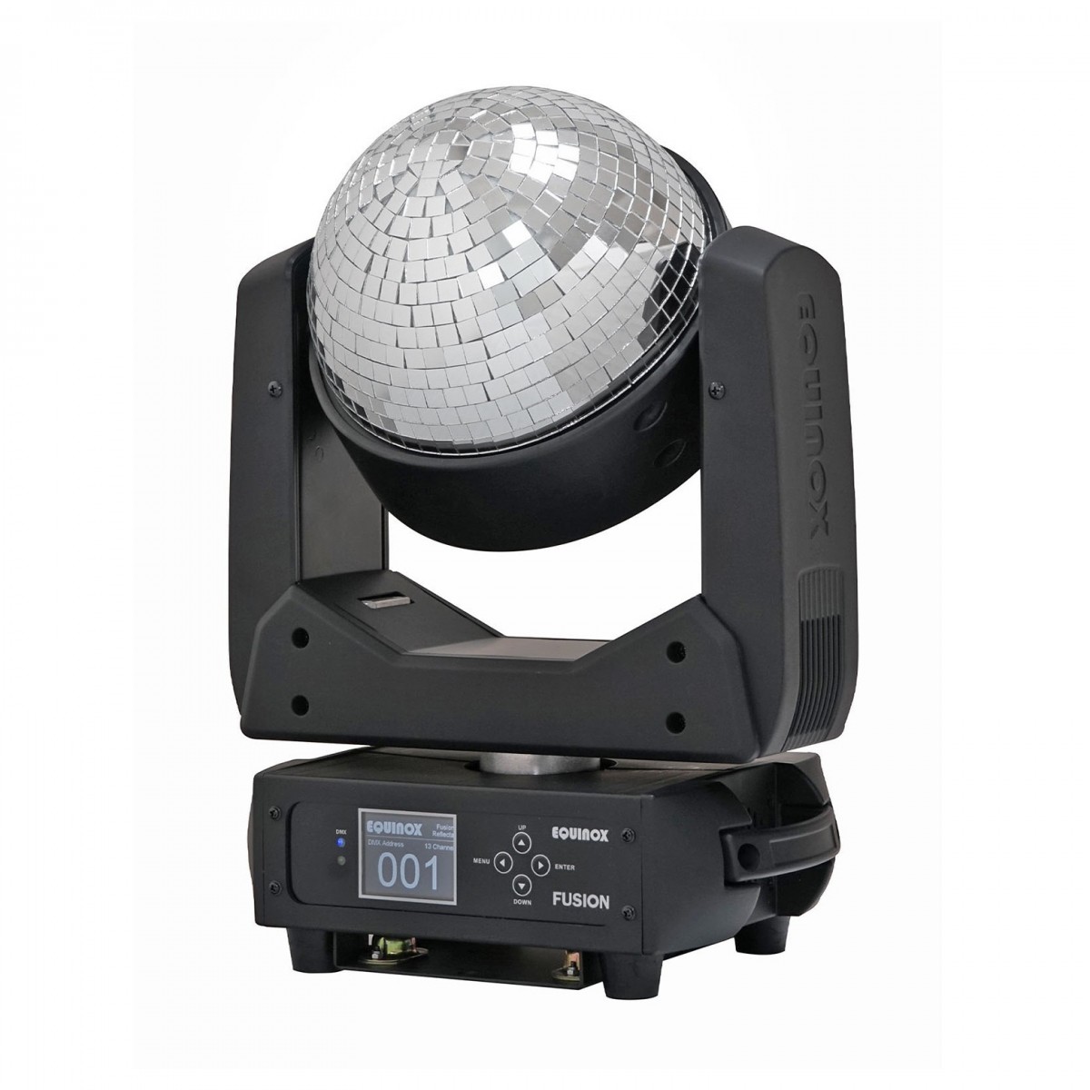The Fusion Reflecta features a highly reflective flat mirror with a diameter of 178mm, capable of projecting powerful beam effects across large venues. With a quick DMX value adjustment, the mirror flips 180 degrees to unveil the captivating mirror ball, distributing hundreds of shimmering light shards throughout the room when illuminated by compatible fixtures.