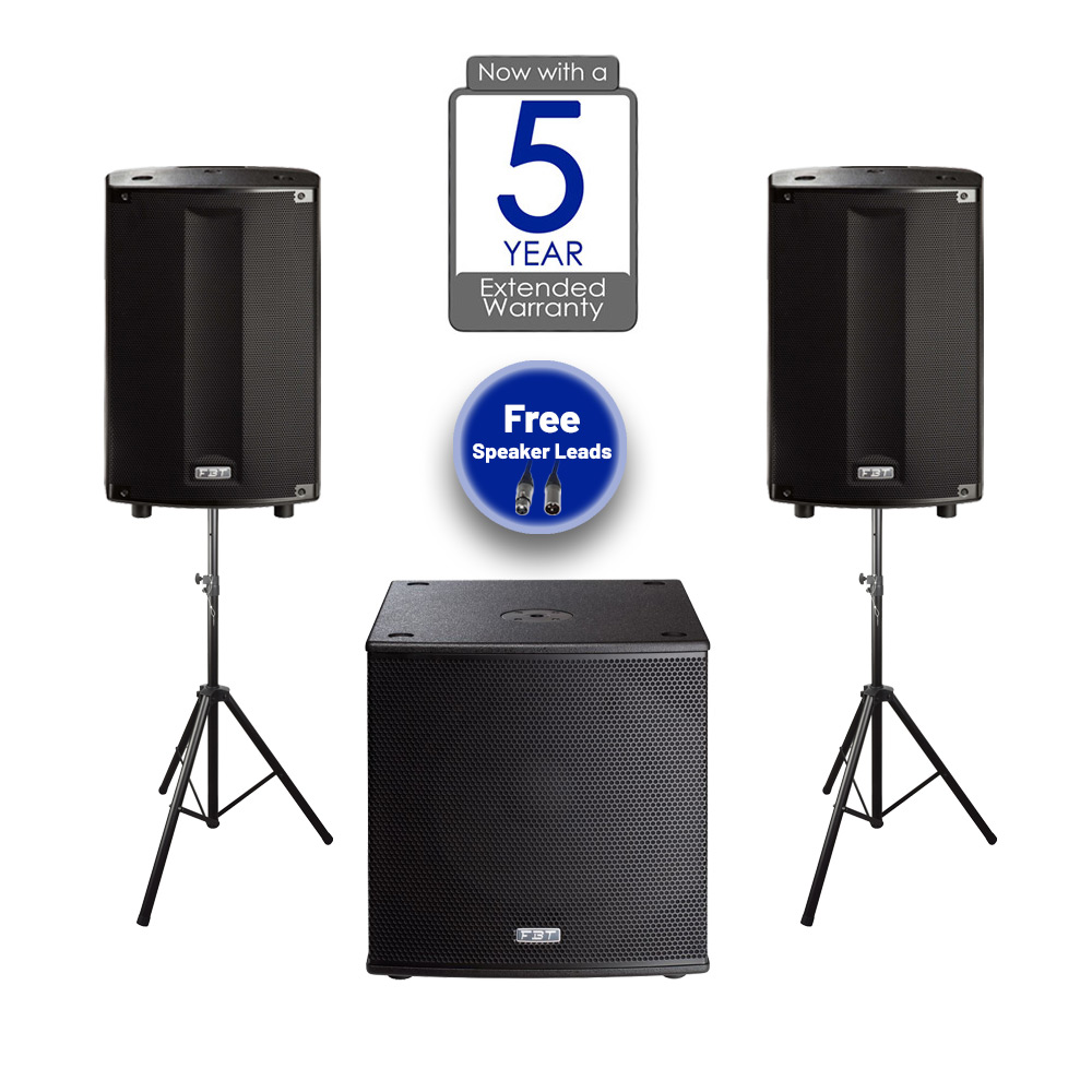 The FBT ProMaxX 114A & Subline 115SA 3200W Active PA Package contains two FBT ProMaxX 114A 14" Active PA Speakers, one Subline 115SA 3200W Active Subwoofer, one pair of QTX Speaker Stands and free XLR Speaker Leads. This speaker package is a complete bundle that provides a high-quality sound setup with ease.