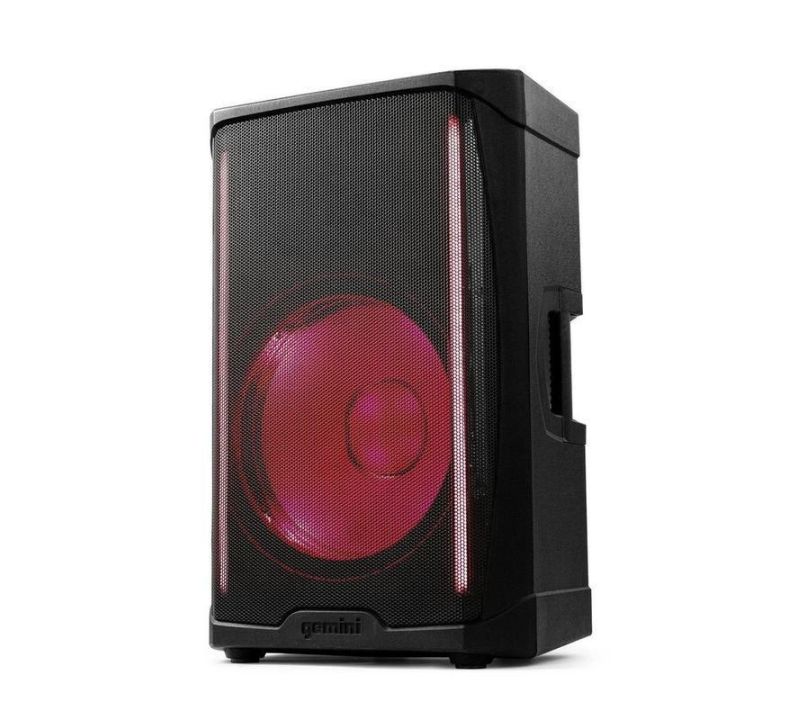 The Gemini GD-L115BT is an active PA speaker with 3-channel mixer and adjustable beat-synchronised party lights. Bluetooth® playback, twin XLR, 1/4" mic/line, RCA, and AUX inputs are all available on the GD-L115BT. Each channel has its own set of level controls and a clip LED. Master volume with bass and treble controls for EQ adjustment. Additional speakers can be connected via the balanced XLR output. High-efficiency Class-D amplifiers produce massive power [1000W peak (700W LF + 300W HF) 500W continuous RMS (350W LF + 150W HF)] to power a massive 15-inch deep bass woofer with a high-temperature voice coil. The GD-115BT's flexible housing provides for multiple configuration options, including stand-mounting and tilting on edge for wedge monitors.