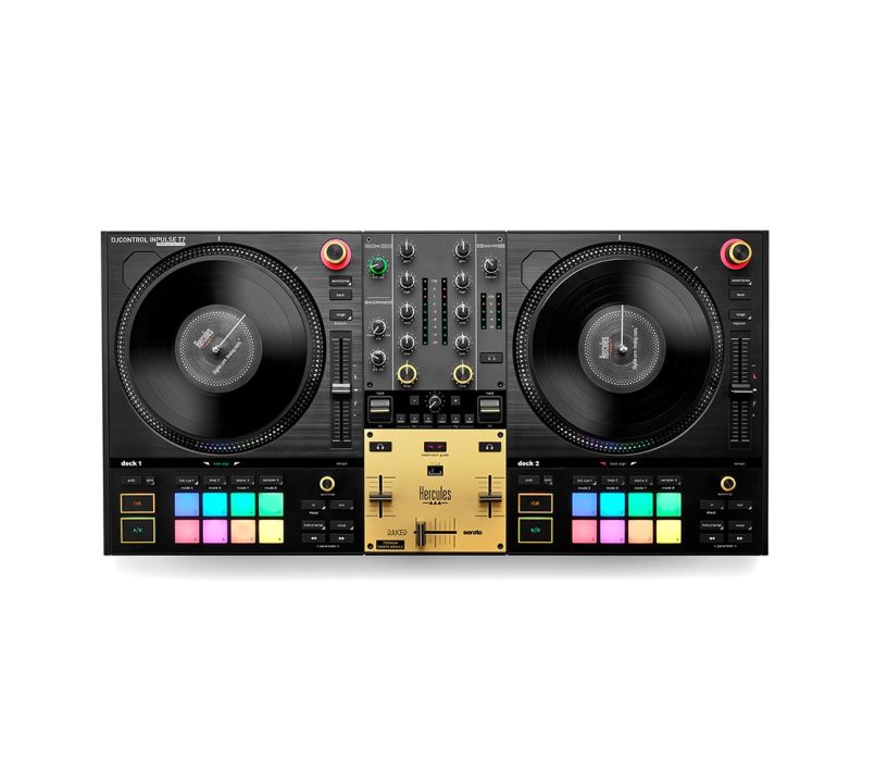 The Hercules DJControl Inpulse T7 Premium is a 2-deck USB DJ controller equipped with a built-in audio interface and a central mixer that includes a microphone input, making it a versatile solution for DJs of all levels. Designed for both portability and performance, it features gold-coloured accents, a high-quality fader module, and comes with a convenient carry bag.