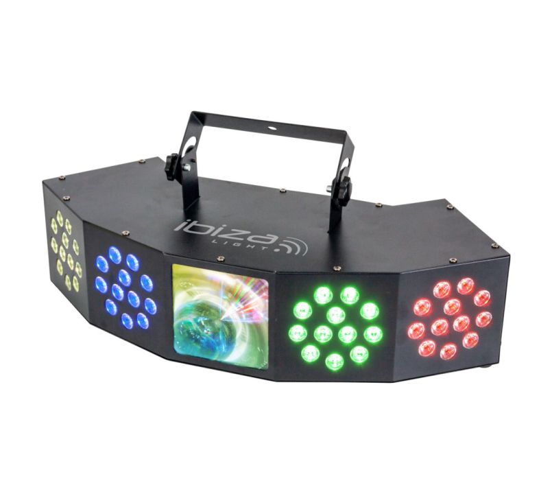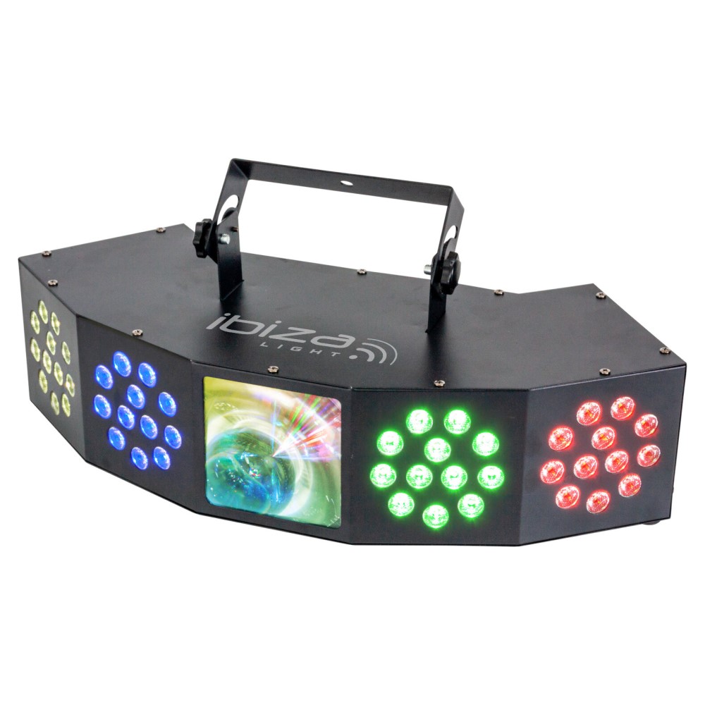 The Ibiza Light COMBI-FX4 3-IN-1 is a Wash-Moon-Strobe Light Effect with DMX. It is a versatile light effect that contains the three most popular lighting effect in one unit.