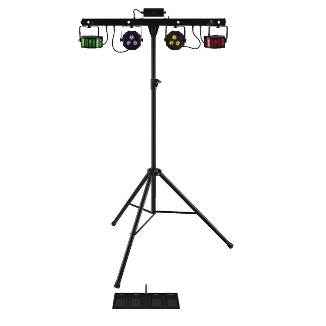 The FXBAR-5SET comes complete with two laser diodes, one 100mW 650nm red laser diode, and a 30mW 532nm green laser diode. There are also two LED derby lighting effects that hang from the T-bar, the effects make use of a 6w RGB LED to provide you with vibrant colours while the LED spotlights are each fitted with three RGB 3w LEDs with a 13-degree beam angle. Also, provide in the kit are four 1w white LED strobes that are integrated into the lighting stand’s T-bar and have a beam angle of 8-degrees. The LED derby effects and spotlights can be individually adjusted and repositioned so you can shine the vivid lights exactly where it is needed.
