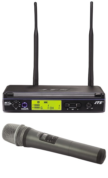 The JTS IN-164R/IN-264TH system is a wireless UHF microphone system that consists of an IN-164 receiver and an IN-264 handheld microphone.