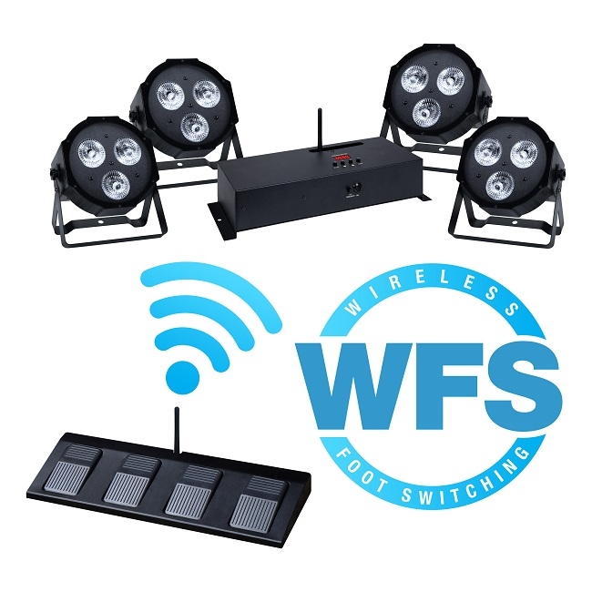 - Complete kit includes: 4 x wired par cans / controller / wireless footswitch controller mains power lead / instruction manual