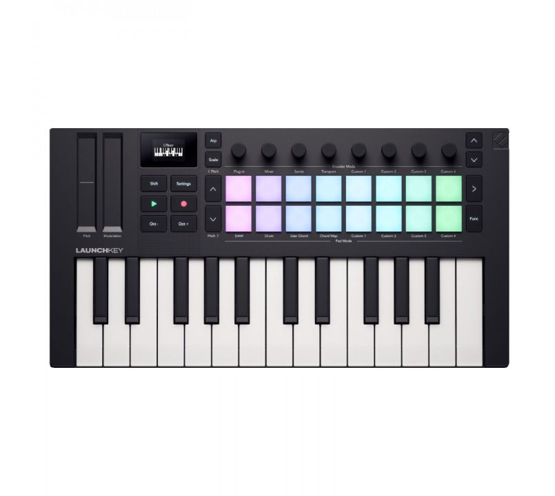 Find inspiration wherever you go with the Launchkey Mini 25 MK4, a portable, all-in-one DAW controller featuring two octaves of synth-action minikeys and 16 patented FSR pads ideal for finger drumming, clip launching, and more. This next-generation Launchkey opens up new creative possibilities within your DAW, with hardware synths, or on your iPhone and iPad. Expanded Chord, Scale, and Arpeggio Modes help you stay in key and perform expressively, all while providing detailed feedback on the new, crisp OLED display.