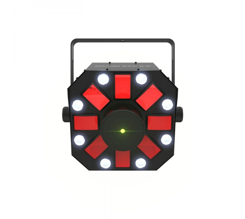 Chauvet DJ Swarm 5 FX ILS 3-in-1 LED Lighting Effect that combines red and green lasers, white strobe effects, and RGBAW spinning derby effects into one fixture for movement and colourful vibrant effects at any event.