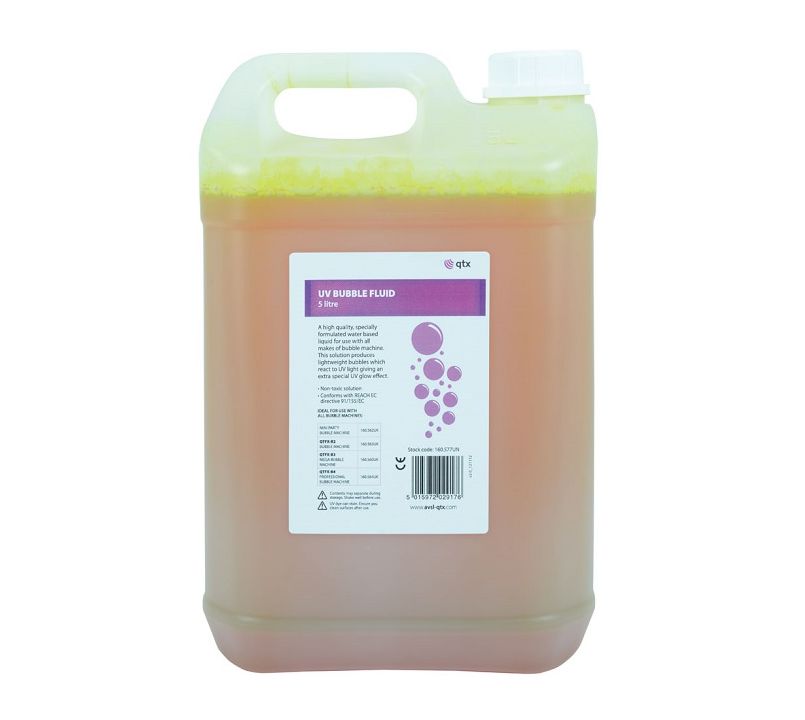 Introducing the QTX UV Bubble Fluid, the perfect addition to any event or gathering! This high-quality, water-based formulation is designed to create an enchanting display of lightweight bubbles that shimmer and glow under UV light. Whether you're hosting a party, setting up a theatrical performance, or just looking to add some fun to your outdoor activities, this bubble fluid is compatible with all makes of bubble machines.