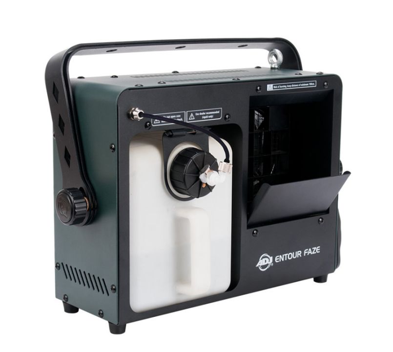 The ADJ Entour Faze is a 450w smoke machine party effect that enhances lighting FX and includes a 3L fluid tank, DMX control, and rapid heater technology.