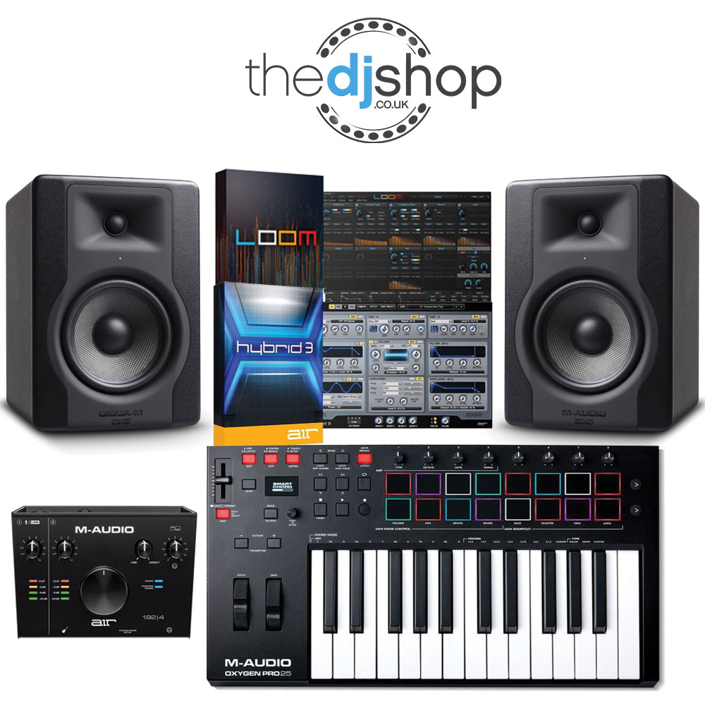 This complete M-Audio Music Production Package Bundle provides you with everything you require to kick start your music production journey including a pair of BX5 D3 production monitor speakers, alongside an Oxygen Pro 25 USB 25-key MIDI keyboard, and an AIR 192|4 USB audio interface for recording/playback.