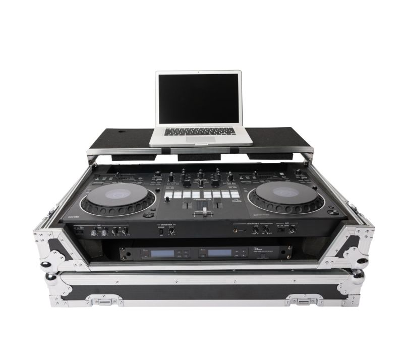 The Magma DJ-CONTROLLER WORKSTATION DDJ-REV5 19“ is designed specifically to house the Pioneer DDJ-REV5 Controller and a 19" rack mount item (1U), such as a wireless microphone setup, power strip, or storage drawer. This case offers the best protection for mobile use when travelling and is made of 9 mm vinyl laminated plywood, strong aluminium profiles, heavy duty butterfly locks, and smoothly rolling wheels. The 1U 19" unit (or smaller devices) can be mounted individually at the front underneath the controller using the 19" rack mounting brackets that are included.