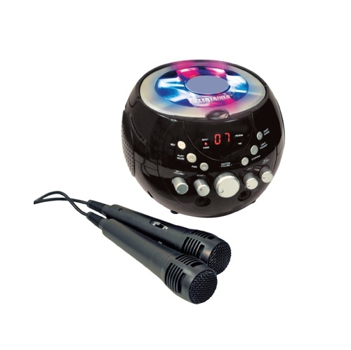 The MR.Entertainer KAR121 is a boombox style karaoke machine that comes equipped with Bluetooth connectivity and is supplied with two microphones as well as a CD loaded with pop music for you to sing along to.