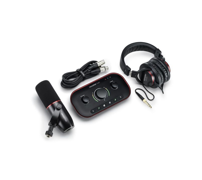 The Focusrite Vocaster Two Studio includes the Vocaster Two Audio Interface, Vocaster DM14v broadcast-quality dynamic microphone, and a pair of HP60v closed-back studio headphones.