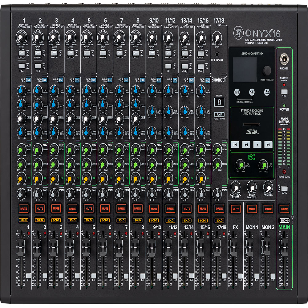 Create the sound you want. Mackie’s Onyx 16 analogue mixer provides sound quality like no other, the multi-track recording and host of built-in effects make it perfect for live audio, home recording, or professional systems.