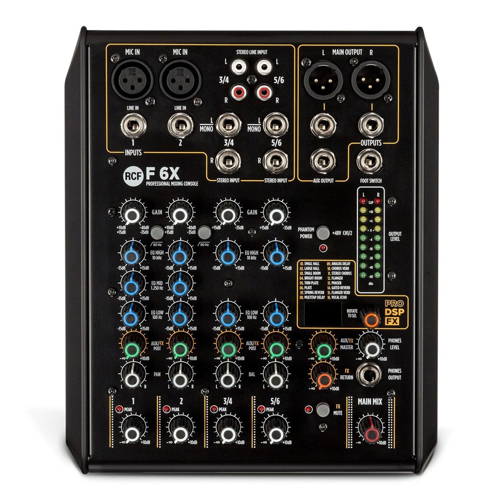 The F 6X comes with sixteen inbuilt PRO DSP FX, which include delays, reverbs, chorus, flangers, and echoes. Combined with cutting-edge EQ, which provides three-band control (High/Mid/Low) on each mono channel and two-band control (High/Low) on each stereo channel, you can achieve accurate tone-shaping for any portion of your mix.