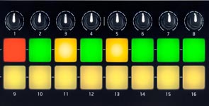 16 velocity-sensitive pads 16 velocity-sensitive pads for both colour-matched feedback when launching clips and creating expressive drum beats. |