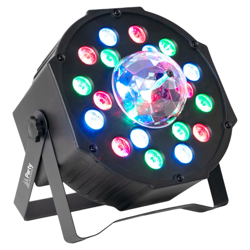 The Party Light and Sound PARTY-PAR-ASTRO is a DMX LED PAR Projector with Astro Effect. It is a smart PAR projector with tricolour LEDs and an Astro effect. It features seven DMX channels, eighteen red, green and blue LEDs, an astro effect with three red, blue and green LEDs and DMX, auto and sound control operating modes. A mounting bracket is also included.