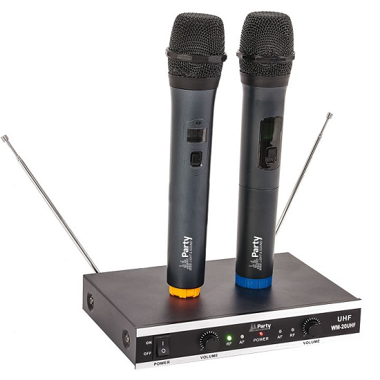 The Party Light and Sound WM-20UHF is a wireless microphone system composed of two handheld microphone transmitters and one receiver.