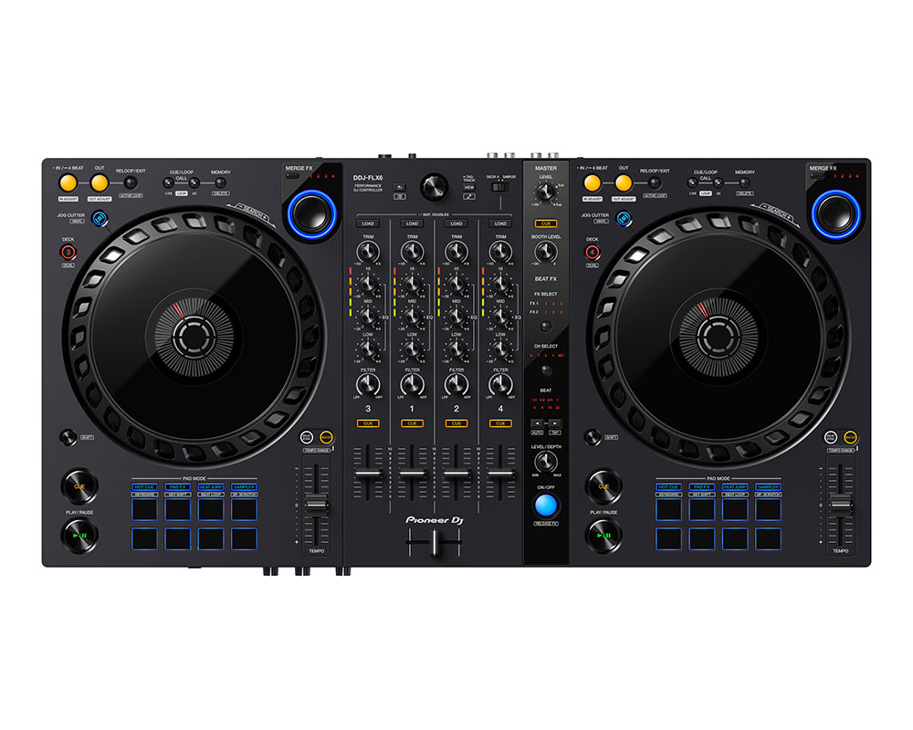 The Pioneer DJ DDJ-FLX6 is a 4-channel DJ Controller that boasts new features, a unique style, fresh looking layout, full-sized jog-wheels, use of pro-sounding scratch effects, and the ability to mix tracks from different genres effortlessly. The software options for the controller is flexible as the controller’s DJ Performance functions can be unlocked with either rekordbox or Serato DJ Pro.