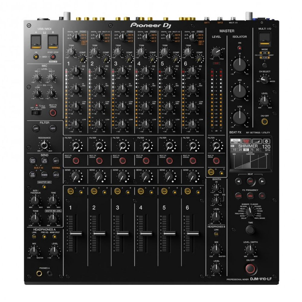The Pioneer DJM-V10-LF is a 6-channel mixer that mirrors the same impressive high-quality specifications and features as the DJM-V10 except for introducing long (60mm) channel faders with optimised curves. Additionally, there is a new custom-designed preset which allows for smooth performance and precise mixes.