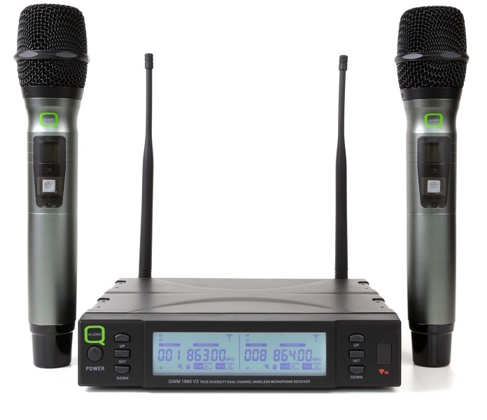 The Q-Audio QWM 1960 HH is a professional, dual channel wireless UHF microphone system which includes two handheld microphones with integrated transmitters and a receiver.