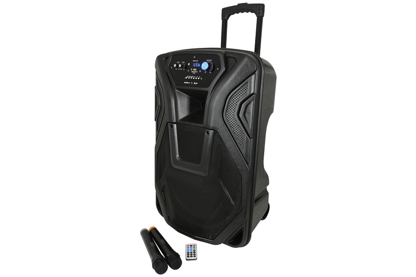 The QTX Busker-15 is a portable PA speaker that features a 15-inch woofer alongside a built-in rechargeable battery, telescopic handle and wheels for ease of transport and an integrated amplifier with a digital display and includes two wireless VHF microphones.