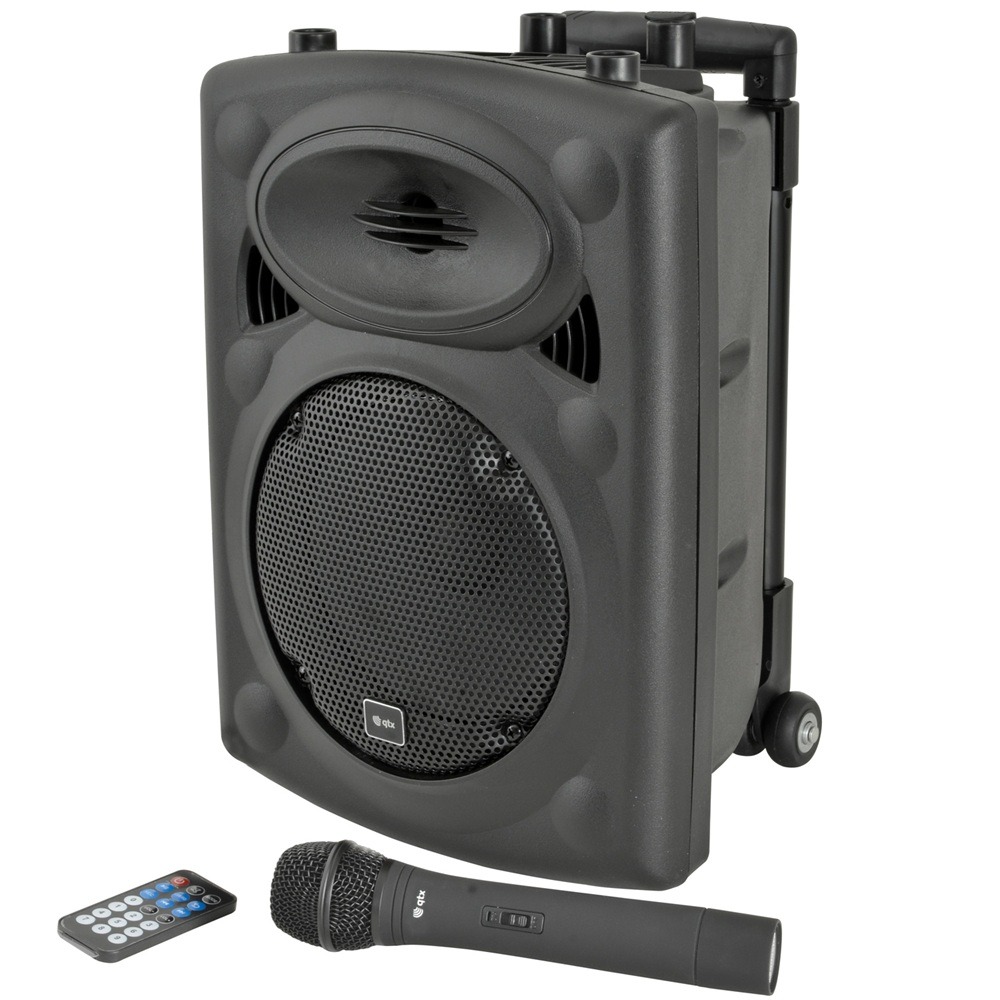 The QTX QR8PA Portable PA Speaker is a compact all in one sound system designed for events, parties, presentations and mobile performers. Housed in a durable QR style speaker cabinet, it features a built in amplifier powering a main driver and compression horn to deliver clear vocals and music playback in a wide range of environments.