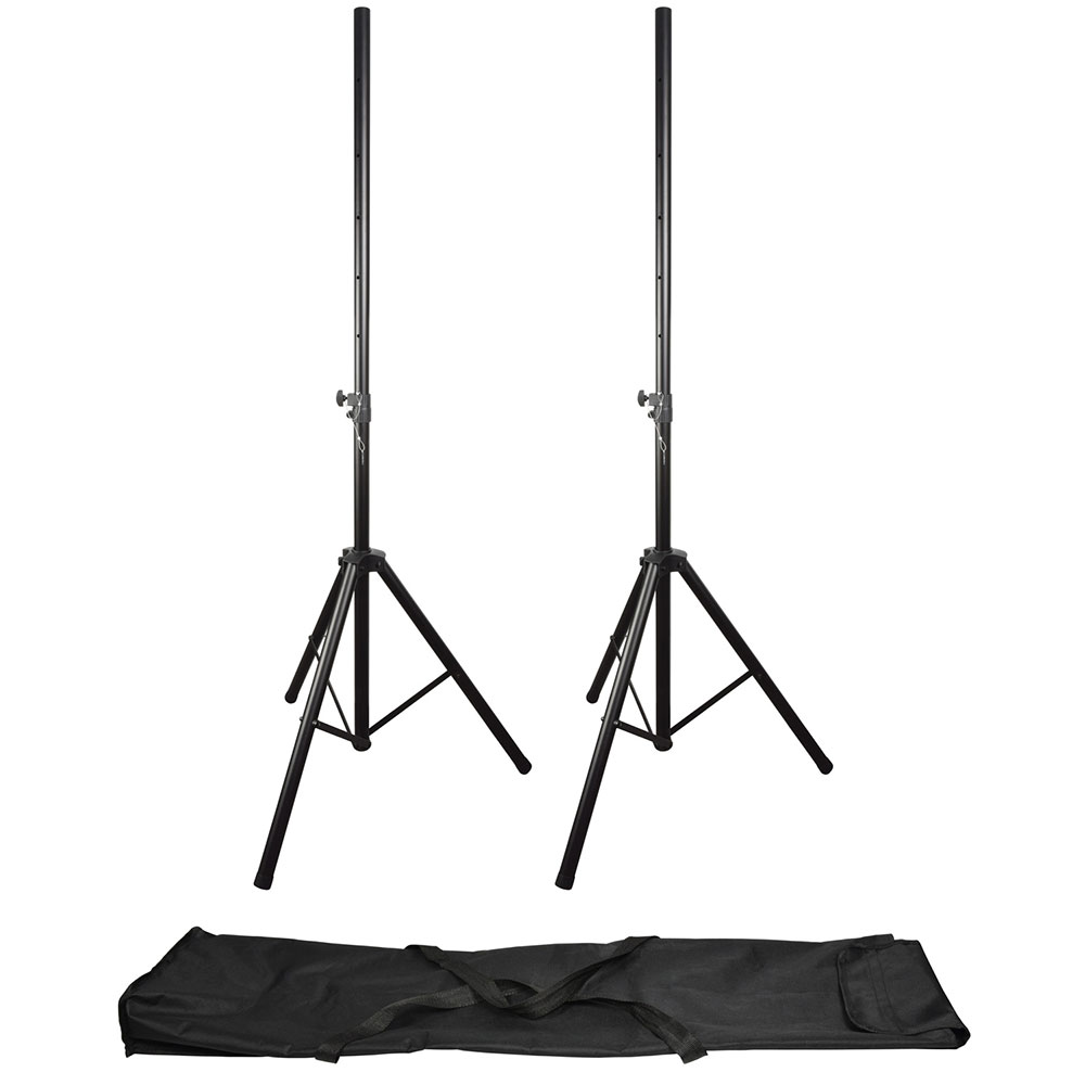 A pair of robust steel stands with lockable height adjustment. Can support large speakers with 35mm top hats. Supplied with a heavy-duty carry bag.