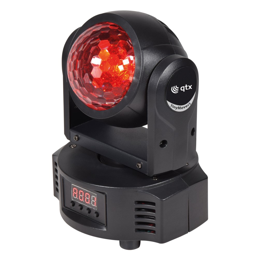 The QTX TinyMover3 is a 3-in-1 40W LED Mini Moving Head which is compact yet remarkably bright. It features a sharp green laser and multi-coloured ball and ring effects.
