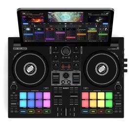 The controller is ideal for those new to DJing and is crammed with features including eight performance pads (Neural Mix™, hot cue, auto loop, touch FX, sampler, slicer, bounce loop and looper) for each deck, touch-sensitive jog wheels, large FX Paddles (hold and toggle), smart mixing section, colour-coded drum pads and various input/output connections.