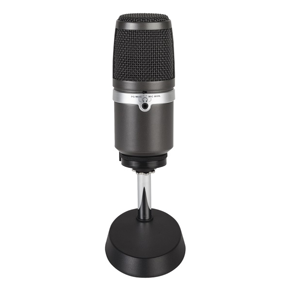 The Reloop sPod Platinum is a USB condenser microphone designed to be used for recording podcasts and features an integrated interface with headphone output and volume control.
