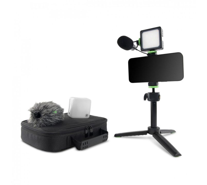 Achieving professional production quality has never been easier with the Mackie EM-93MK vlogger kit. The ultra-compact EM-93M microphone comes with both fuzzy and foam windscreens, while the variable temperature LED video light with diffuser, universal phone mount, portable tripod, extension pole, and carry case offer maximum versatility.