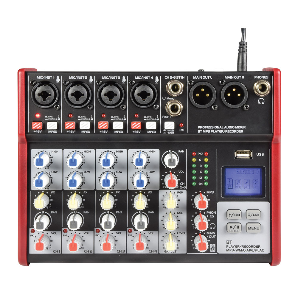 Input channels contain settings for High/Low EQ and Pan, and mono channels have an Effects level to adjust the amount of internal digital delay effect applied to vocals or instruments. An inbuilt player/recorder with a backlit display may accept a USB memory stick holding compressed music files in various formats or connect to a smart phone through Bluetooth. The output is given via a pair of balanced XLR connections and has extremely low noise operation for high-quality studio or live performances.