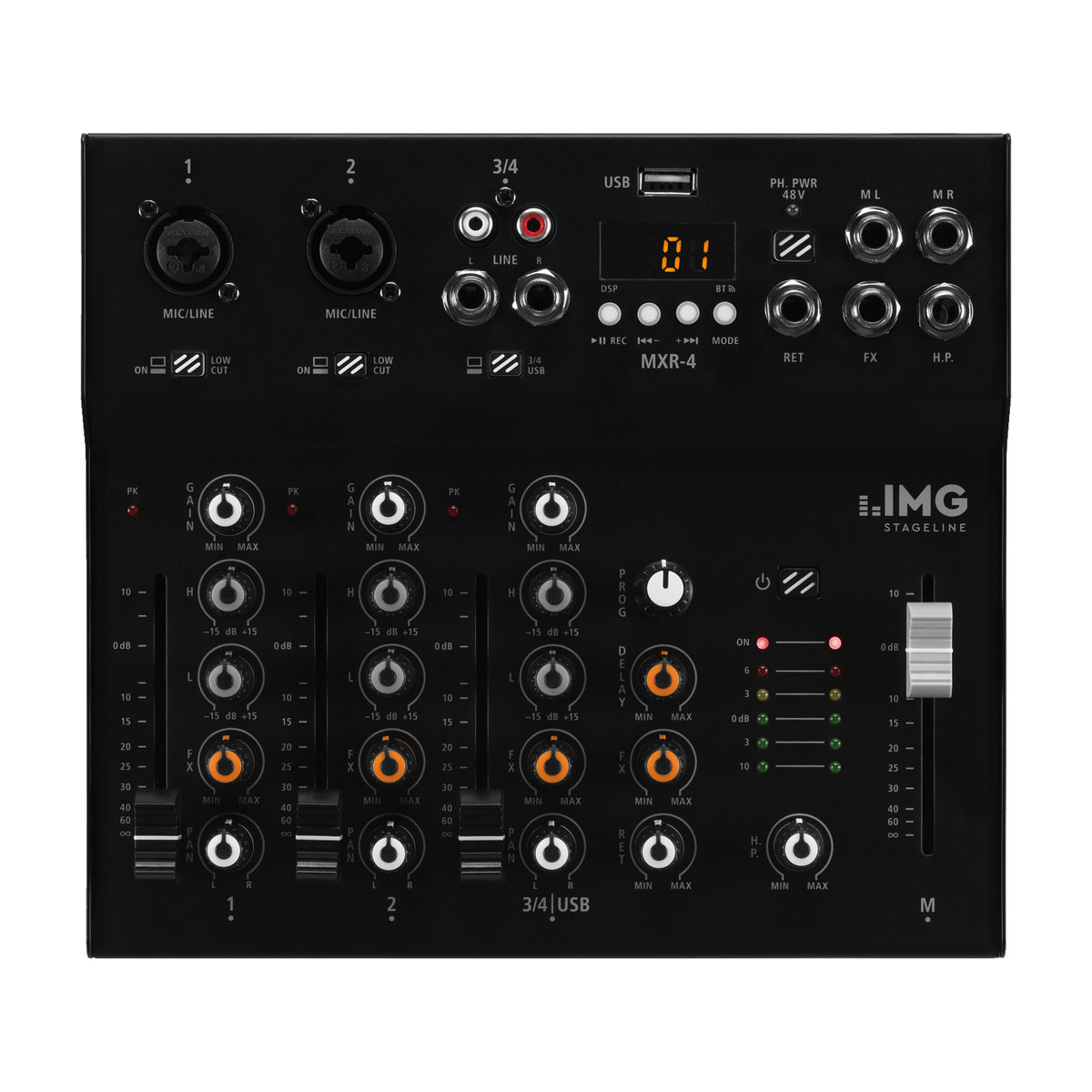 The IMG Stageline MXR-4 is a 4-channel analogue audio mixer with a USB and DSP effect unit, an MP3 player, and a Bluetooth receiver. The full-duplex USB connector enables simultaneous recording and reproduction, as well as acquiring audio data from and recording audio into a PC.