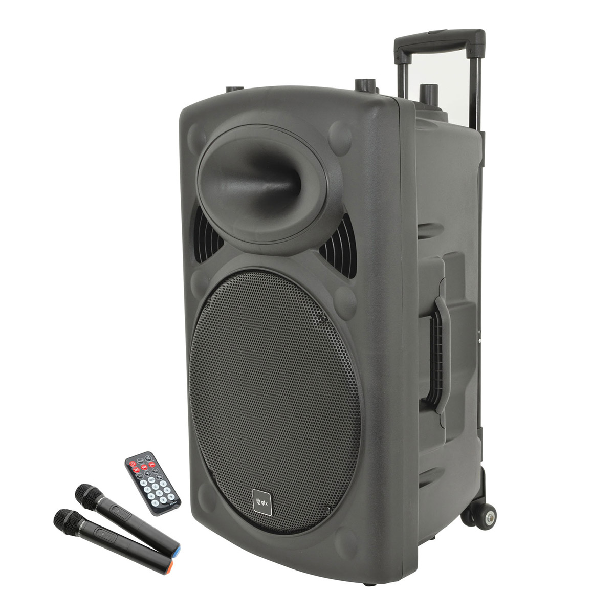Introducing a highly portable PA unit designed in a compact trolley-style with convenient features for various applications. This unit is equipped with a retractable pull handle on the top and a side-mounted carry handle for easy transportation. It offers versatile input options, including 2 VHF wireless microphones (included), 2 additional mic inputs (one dual-function for guitar), a mini jack for phones, tablets, laptops, and mp3 players, as well as RCA in/out for DJ setups.