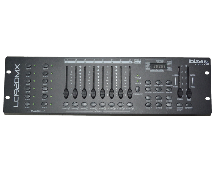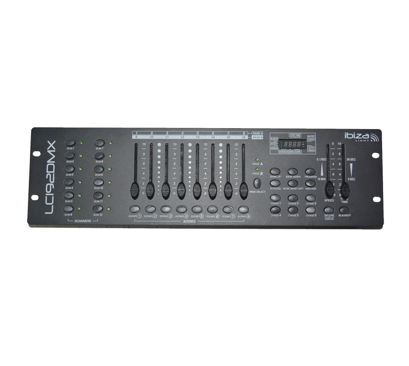 The Ibiza Light LC192DMX is a 192-Channel DMX lighting controller that allows you to control up to 12 lighting effects with 16 channels available per effect. The controller provides a broad range of professional features such as time and speed controls, MIDI control, and the ability to recall a total of 184 scenes.