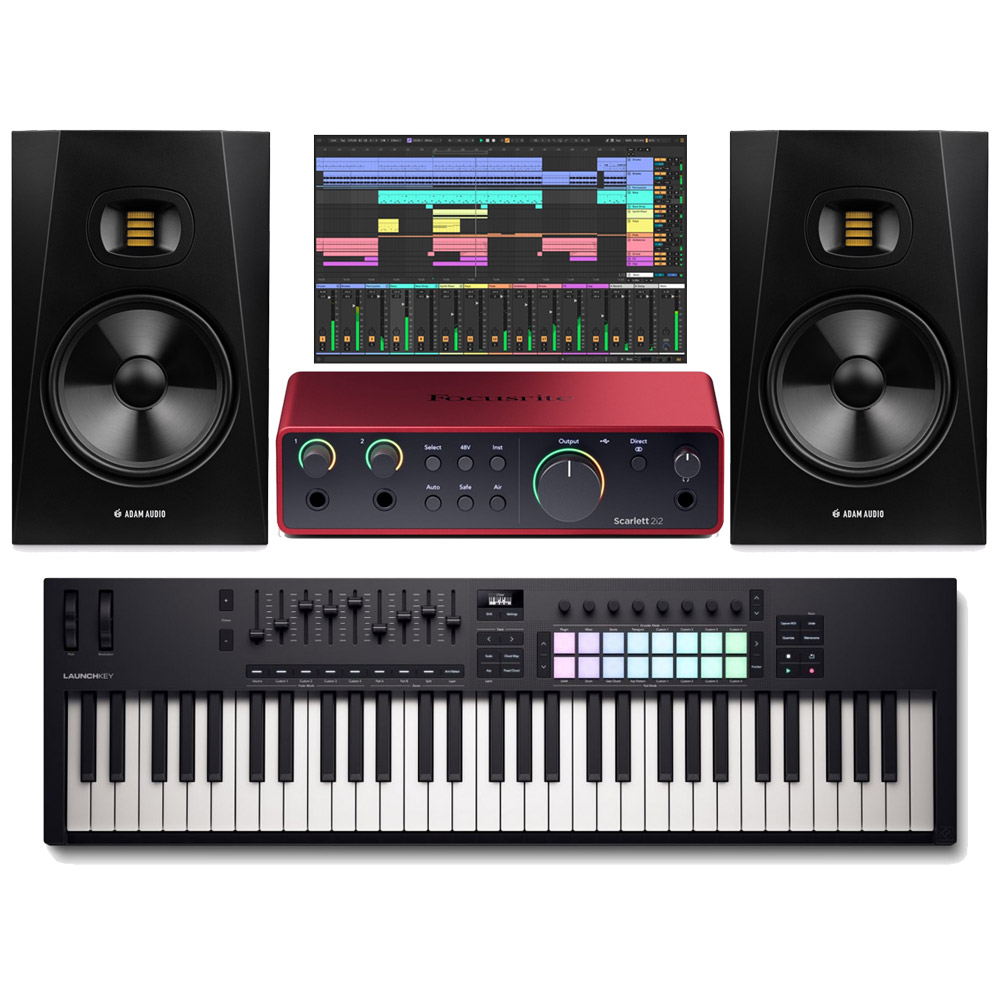 This amazing bundle is ideal for anyone looking to set up a professional and high-quality music production studio. The bundle includes a Focusrite Scarlett 2i2 4th Gen Audio Interface, a Novation Launchkey 61 MK4 MIDI Keyboard Controller, two Adam Audio T8V 8" Studio Monitor Speakers and free professional-grade music production software.