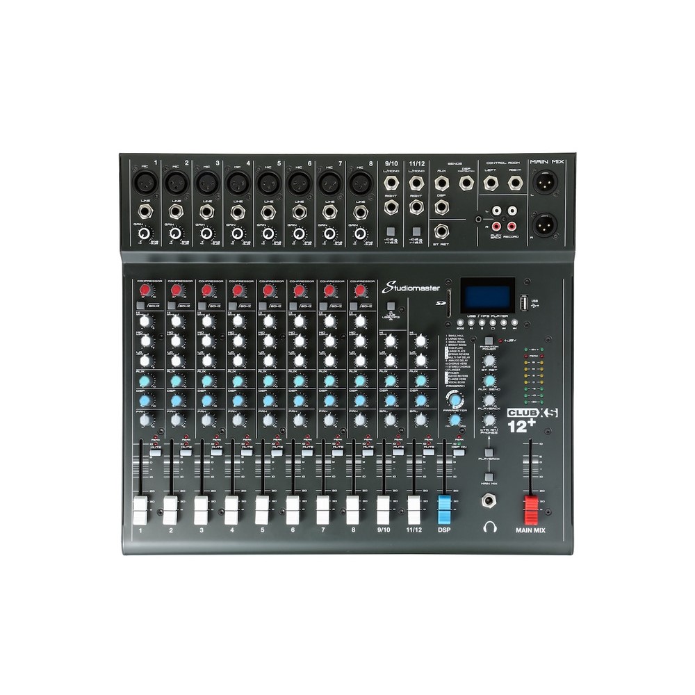 The Studiomaster Club XS 12+ mixer enhances the features of the standard Club range with the addition of a DSP On/Off foot switch socket and a redesigned aesthetic, featuring control knobs finished in Studiomaster digital black.