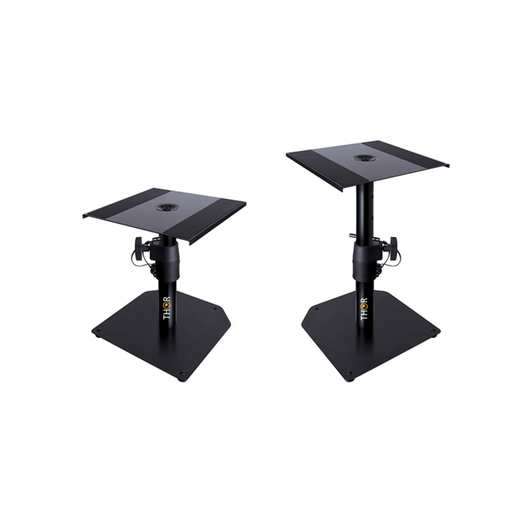 A set of studio and DJ monitor desktop stands with angle top plates that may be adjusted. THOR Monitor Stands feature desktop positioning and can be height adjusted up to 380mm/15 inches. The top plate has a variable tilt angle for precise studio placement and the rubber isolating feet with non-slip offer anti-resonance properties.