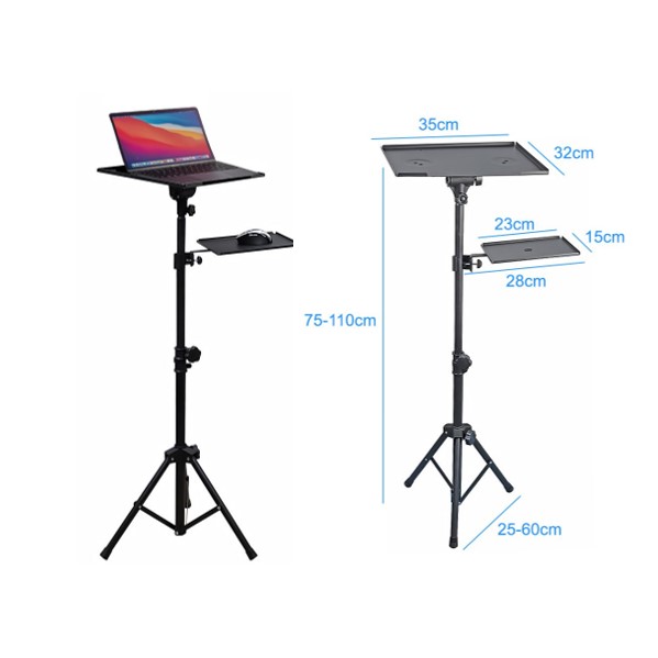 Adjustable height laptop, tablet or projector stand with an additional shelf. It is made from steel material with a sleek black finish.